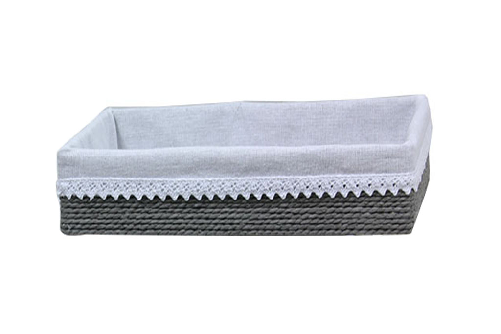 Chest of drawers made with strips of grey paper on cardboard. Inside it is lined with a removable white fabric with a lace detail. This basket can be used to decorate the home with small accessories inside, as a container for gift lots or to use as a chest of drawers in cabinets. Dimensions: 42*31*10 cm