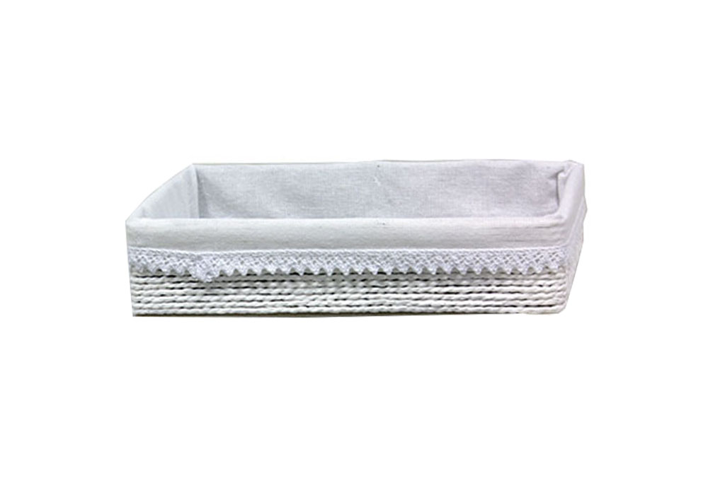 Drawer made with strips of white paper on cardboard. Its interior is lined with a removable fabric of white color with detail of lace. This basket can be used to decorate the home with small accessories inside, as a container for gift lots or to use as a chest of drawers in cabinets. MEASUREMENTS: 37*26*8cm
