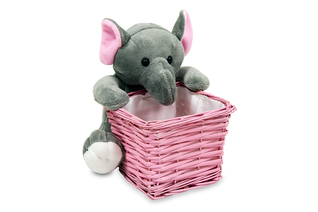Divertida y tierna bandeja de mimbre en color rosa decorada con un peluche de elefante Los colores vivos de esta bandeja la convierten en el regalo perfecto para los más pequeños. Ideal para almacenamiento y decoración.