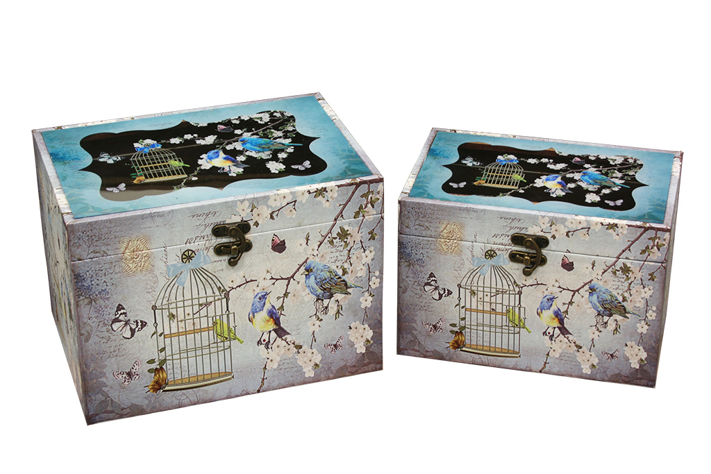 Set compuesto de dos cajas de madera forradas por fuera con poli piel con estampado de imágenes de pájaros en una rama de árbol junto a una jaula, todo ello en tonos azules. Estas cajas tienen un diseño muy original, la tapa es de cristal, por lo que se puede ver el contenido interior, es abatible y tiene un cierre metálico. Se pueden utilizar para almacenaje en el hogar, como joyero, o para colocar flores en su interior. Medidas: 29.5*21*22 y 26*17*18 cm.