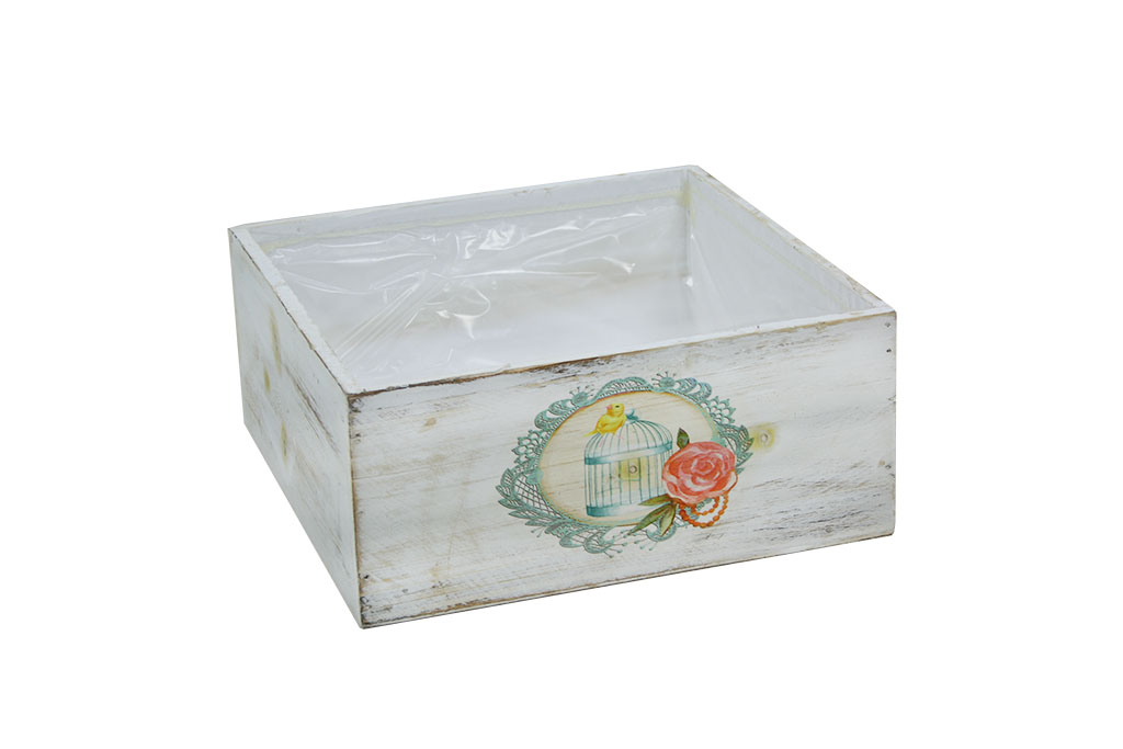 Caja de madera en color blanco envejecida, diseño de un pajarito en colores pastel. Forrada en el interior con plástico. Ideal para decoración o usar como macetero