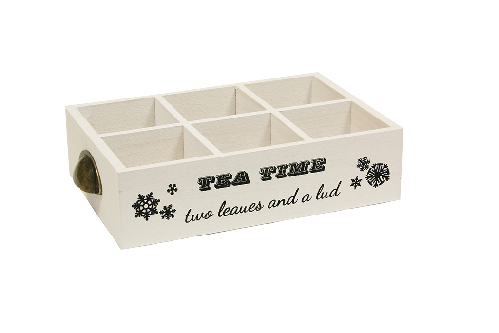 La caja de madera "Tea Time" es el accesorio perfecto para los amantes del té. Su diseño elegante en tono blanco, adornado con detalles y textos alusivos al té, aporta un toque de sofisticación a cualquier espacio. Cuenta con múltiples compartimentos que permiten organizar diferentes tipos de infusiones o accesorios relacionados con la preparación del té. Fabricada con madera de alta calidad, esta caja no solo es funcional, sino también decorativa, convirtiéndose en un elemento ideal para mesas, cocinas o incluso estanterías de salones.