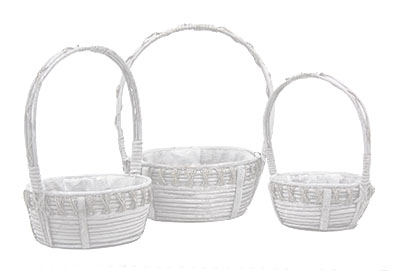 Set compuesto por tres cestas de mimbre color blanco, de diferentes medidas, para usar como maceteros o crear lotes de productos.