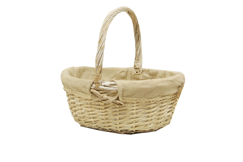 Cesta ovalada hecha de mimbre blanco con el interior forrado con tela blanca con puntilla.