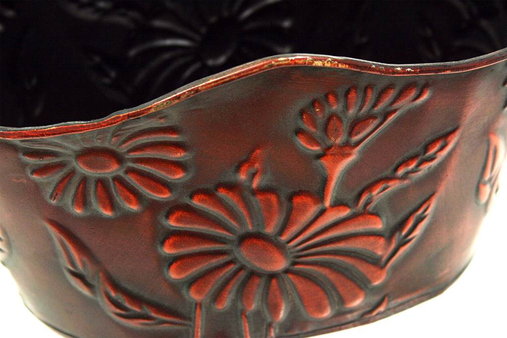 Cuévano hecho de latón color negro y granate con formas vegetales talladas a los lados. Tiene gran capacidad de almacenaje gracias a la altura de la bandeja, que permite colocar frutas y verduras. Cuenta con dos asas para su fácil manejo, es fuerte y resistente con forma ovalada. Su bonito diseño aporta elegancia a la bandeja. Ideal para la decoración del hogar y comercios, para crear lotes de productos o como macetero para flores. Medidas: 30*20*20 cm