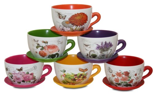 Tazas de ceramica para la preparación de centros de plantas y flores. Cada una de las tazas tiene un dibujo diferente. Con un acabado de muy buena calidad. Estas tazas son muy utilizadas para hacer bonitos centros de plantas y flor. Las vas a poder utilizas como una pieza de decoración en cualquier lugar de tu casa.