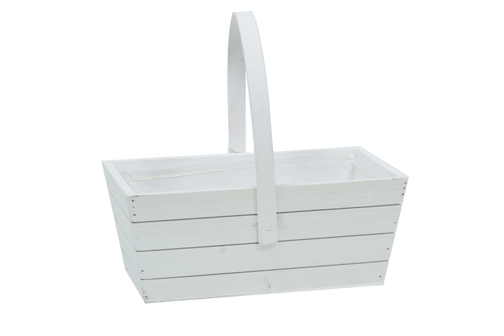 Cesta hecha de madera blanca y forma rectangular. El interior está forrado con plástico transparente por lo que se puede usar como macetero. Ideal para la decoración de cualquier estancia del hogar. Medidas: 26.4*14.5*11 / 24*14.5 cm