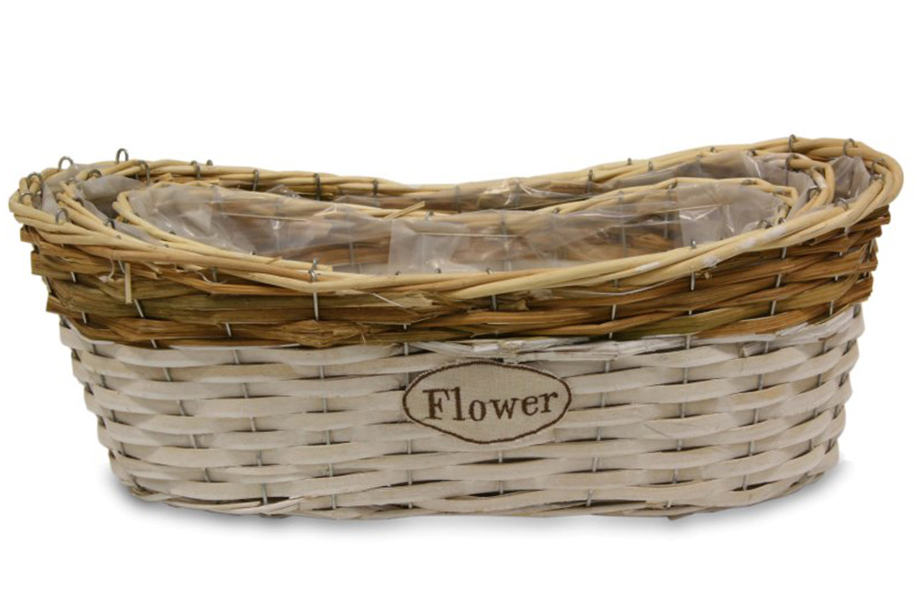 El jardín es uno de los lugares que más vida dan a nuestro hogar, un jardín cuidado y con estilo, transmite paz y serenidad, ya que el jardín es nuestro rinconcito de paraíso. Este set de maceteros de mimbre blanco , es una alternativa especial y delicada para nuestras plantas más queridas. Estos maceteros está hechos con mimbre en tono blanco de muy buena calidad. Por dentro están forrados con plástico transparente para acomodar mejor las plantas y poder regarlas sin dificultad. Tienen un bonito diseño con forma ovalada con decoración de tela de saco con la palabra "Flowers " en la parte frontal del producto y un detalle de mimbre natural en el borde superior. Estos maceteros están pensados para decorar patios, terrazas y jardines, aunque también son perfectos para el interior de nuestra vivienda. MEDIDAS: 49*24*1418*20*1216*16*10