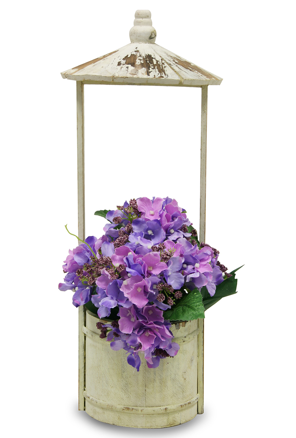 Bonito macetero de madera con forma de antiguo pozo. Ideal para decoración de exterior e interior.