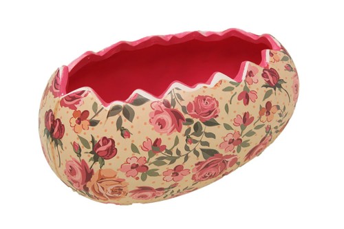 Macetero hecho de cerámica con forma de huevo, su interior es de color rojo y el exterior blanco con estampado de flores rojas y mariposas. Su diseño es original con la parte superior abierta a picos simulando el huevo roto.Coloca este macetero en el exterior de tu vivienda o comercio con plantas y flores en su interior y no pasará desapercibido.