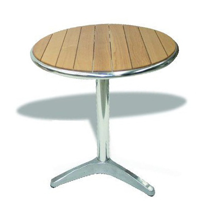 Mesa de aluminio con la parte superor forrada de madera, para colocar en terrazas de bares y restaurantes. Gracias a su material es fuerte y resistente a las inclemencias del tiempo. Tiene soporte con tres patas, perfecta para acompañar con sillas de aluminio alrededor.