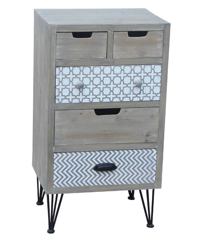 Los problemas de alamacenaje son uno de los mayores quebraderos de cabeza a la hora de buscar muebles y decoración . La MESITA CAJONERA INDIE es un mueble muy práctico a la par de estiloso y decorativo, por lo que puede ser para nosotros la solución más acertada. Esta cajonera está hecha de madera clara con aspecto envejecido y estilo vintange, recogido en los pequeños toques de color y en sus pies metálicos en tono oscuro. Cuenta con un total de cinco cajones de distintos tamaños y gran capacidad, dos de ellos con un estampado geométrico en tono beige sobre un fondo blanco, y los otros tres conservan el mismo tono de la madera en el resto del conjunto. Este mueble está pensado para ser una solución perfecta de almacenamiento (ropa, sábanas, toallas, libros, CDS, utensilios de cocina) , y puede utilizarse en cualquier lugar de nuestro hogar, en el dormitorio como segundo armario, en la cocina como despensa, en el baño para las toallas y utensilios de higiene etc. Su diseño es polivalente. MEDIDAS: 45*35*81