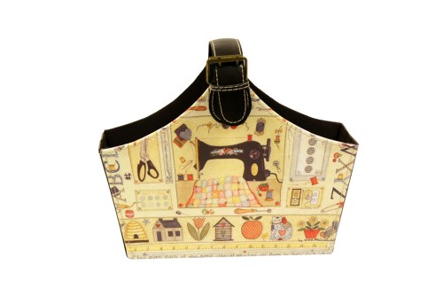 Revistero o soporte para revistas rectangular con estampado de máquina de coser. El asa se puede abrir gracias a la hebilla tipo cinturón