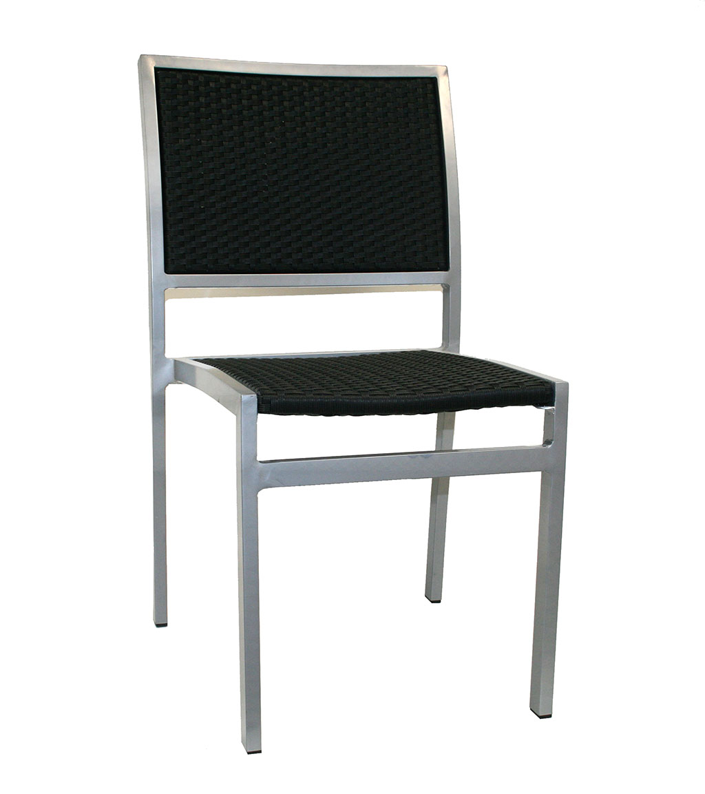 Silla hecha de aluminio y ratán negro para colocar en terrazas de bares y restaurantes.